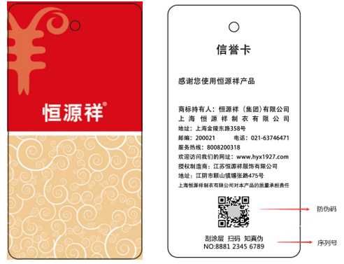 該防偽碼已查詢1次,您所查詢的是恒源祥 “服飾”系列正品標(biāo)識(shí),感謝您的使用!